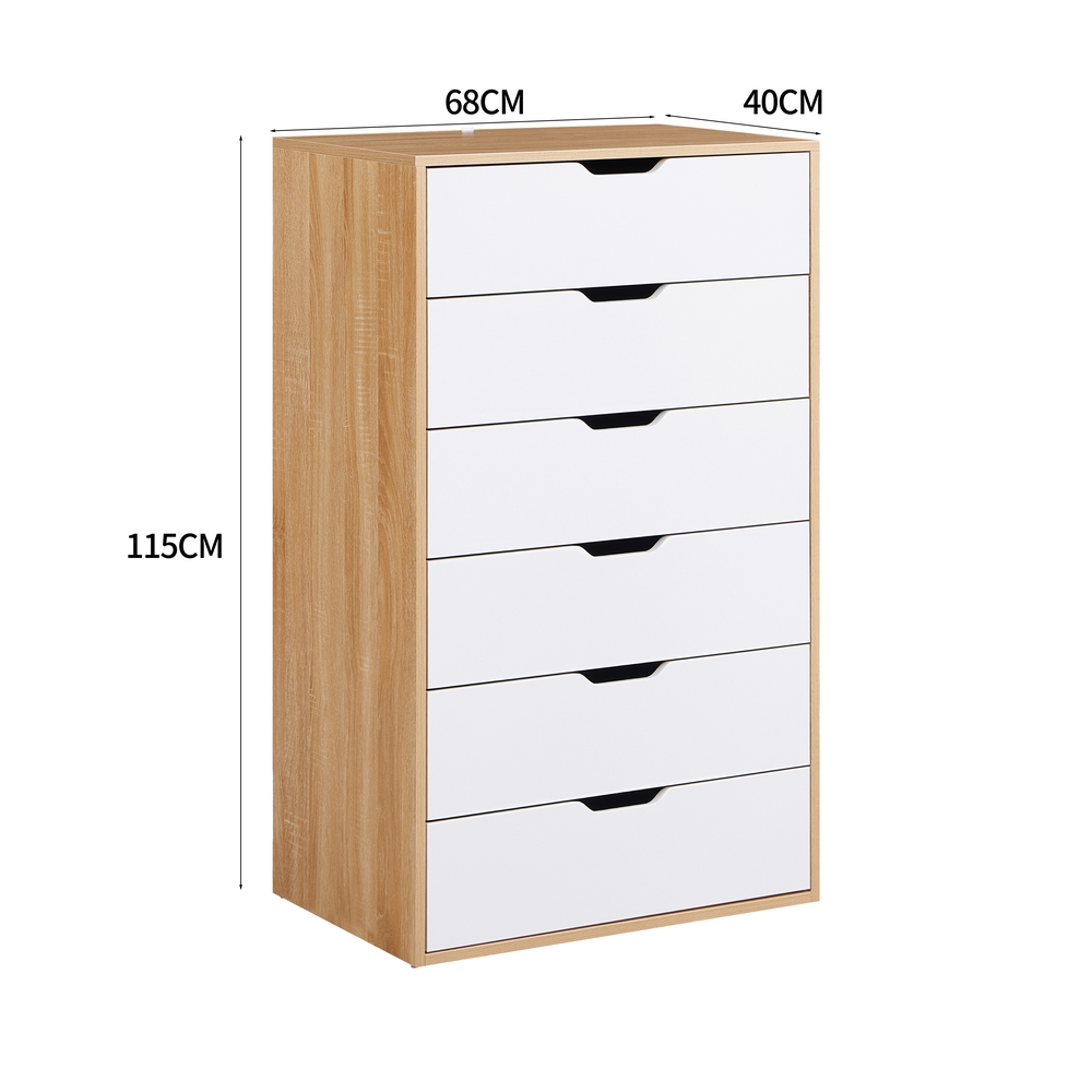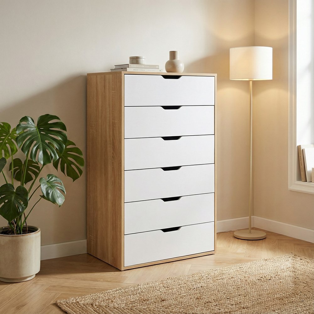 Grazie alla struttura compatta ma sviluppata in altezza, questa cassettiera è ideale per la camera da letto, il soggiorno o lo studio. I sei cassetti scorrevoli offrono ampio spazio per riporre abiti, biancheria, documenti o oggetti di uso quotidiano, mantenendo tutto in ordine.