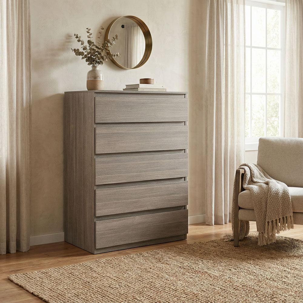 Realizzata in melaminico con finitura rovere e venature effetto noce, si integra facilmente con diversi stili d’arredo. I cinque cassetti, tutti della stessa dimensione, scorrono in modo fluido e silenzioso, garantendo un’apertura e chiusura comoda e regolare.