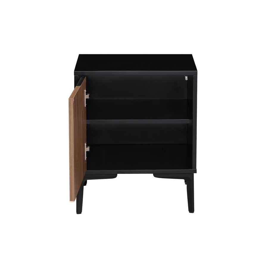 Comodino 1 anta, colore noce e nero. Dimensioni (LxPxA): 44x40x52,5 cm. Materiale legno melaminico Sp.15 mm. Gambe metalliche, 1 anta lavorazione blister cannettata. Striscia perimetrale laterale Sp. 0,8 mm.