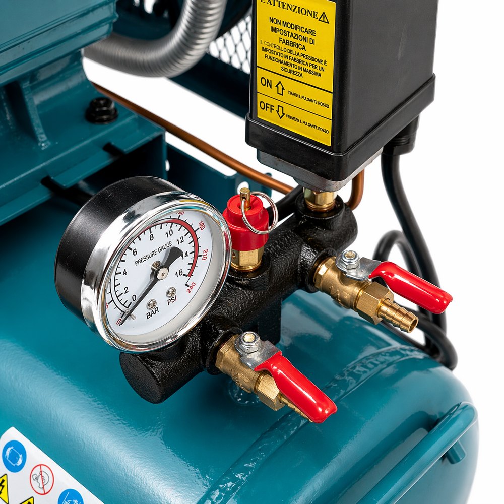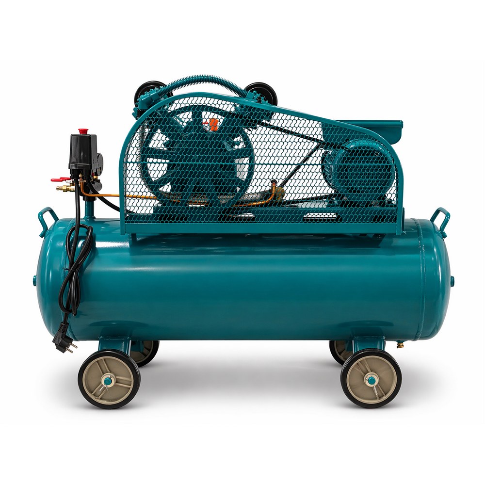 Compressore aria a cinghia 2HP (1,5 kW) con serbatoio da 100L, potente e affidabile. Doppio cilindro e velocità 2800 giri/min per un flusso d’aria stabile e continuo.