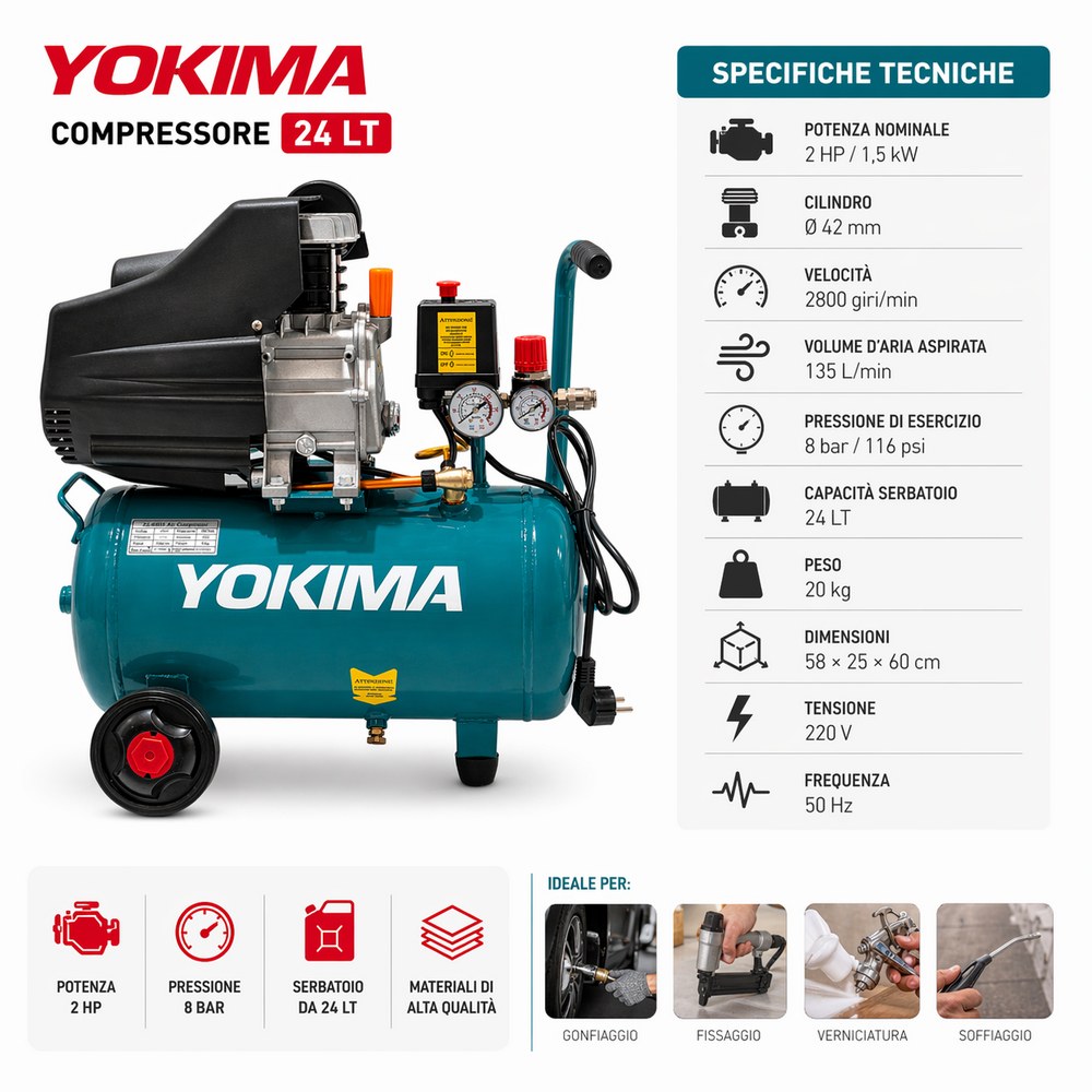 Compressore aria 24L 2HP 8 Bar 135 L/min Compatto 220V - Yokima