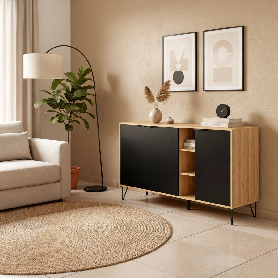 La credenza Madrid è una soluzione d’arredo moderna ed elegante, ideale per arredare con stile il soggiorno, la zona living o l’ingresso. La combinazione cromatica in rovere e nero crea un piacevole contrasto visivo, perfetto per ambienti contemporanei e industriali, mentre le gambe in metallo slanciano la struttura donando leggerezza e carattere al mobile.