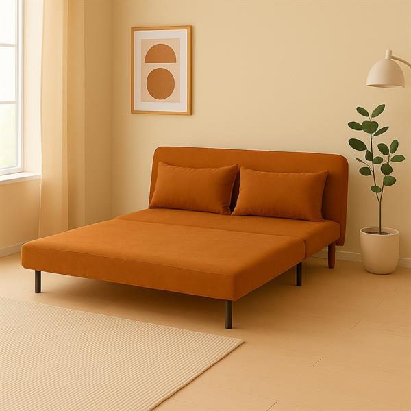 divanetto trasformabile in un letto da 190cm di lunghezza è qui in offerta in questo vivace ed originale colore, a metà tra l'arancio ed il rosa salmone.