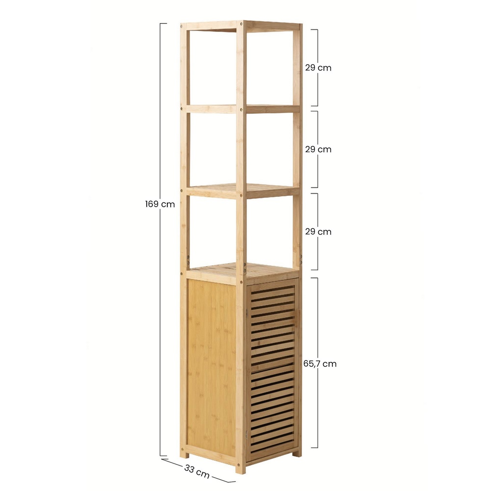Grazie alle dimensioni di 33x33x169 cm, si adatta perfettamente a bagni, soggiorni, cucine o camere da letto, sfruttando lo spazio in verticale senza ingombrare. Il bambù naturale conferisce un tocco caldo e moderno, perfetto per ambienti minimalisti, scandinavi o eco-friendly.