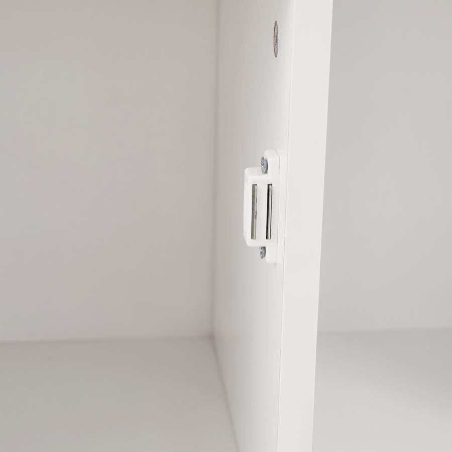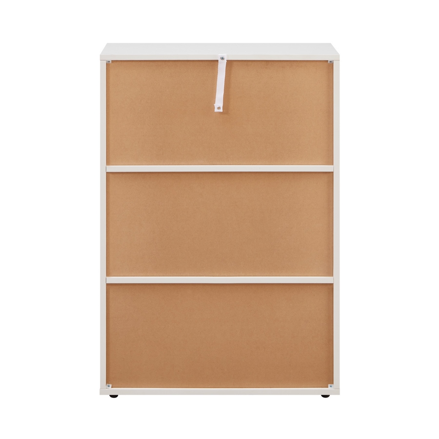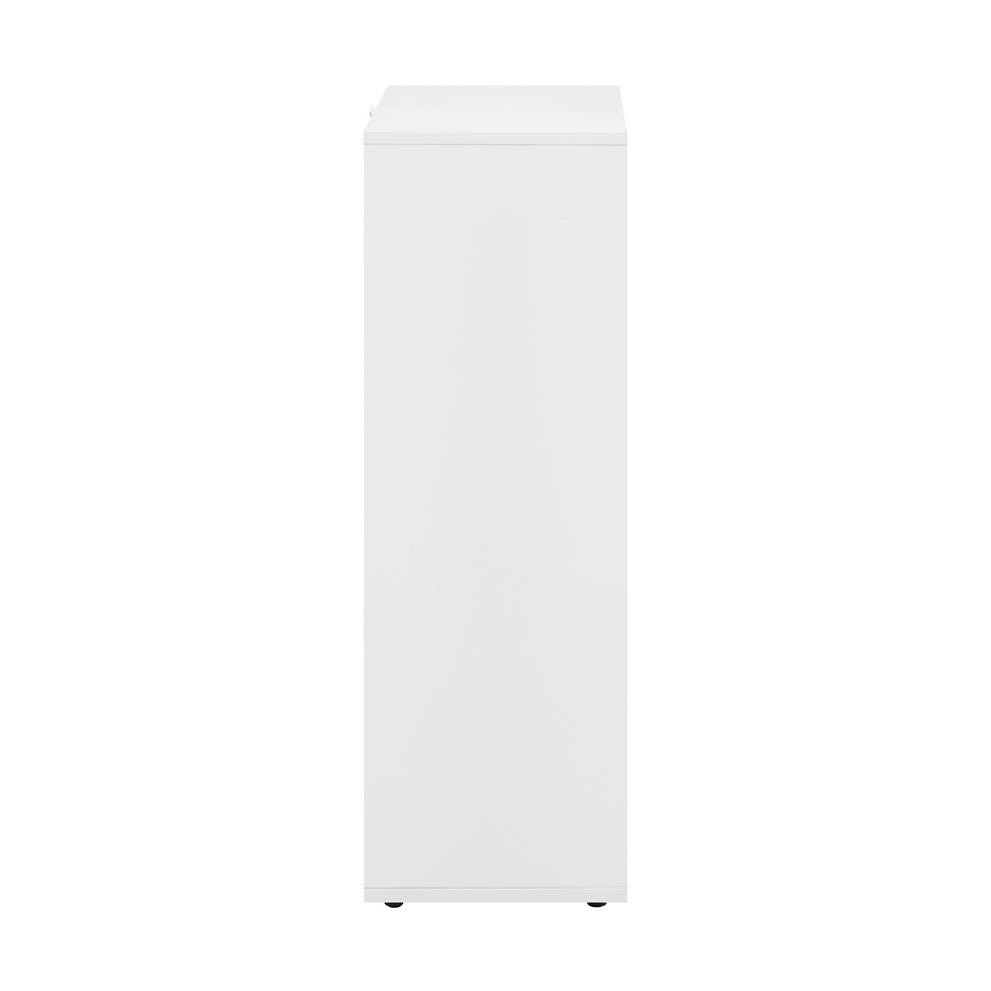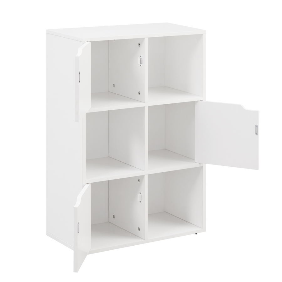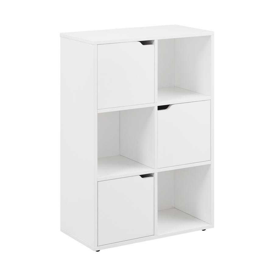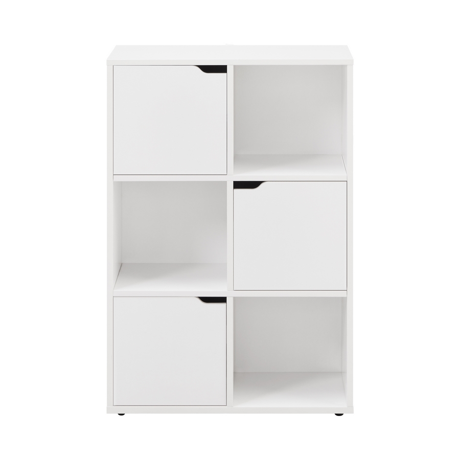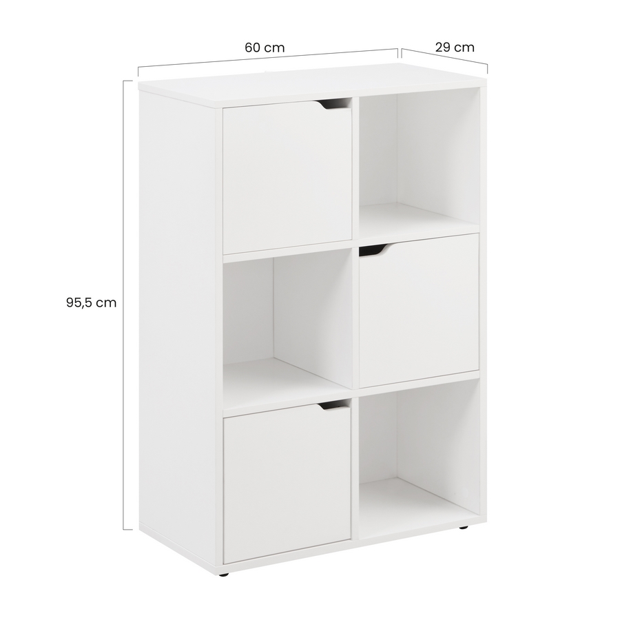 Mobile mensola libreria 6 cubi e 3 ante, colore bianco. Dimensioni (LxPxA): 59,6x29x90,5 cm. Materiale legno truciolare Sp. 15 mm, ante in MDF Sp. 15 mm, piedi in plastica nera.