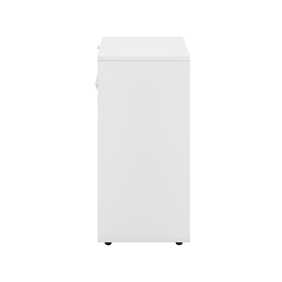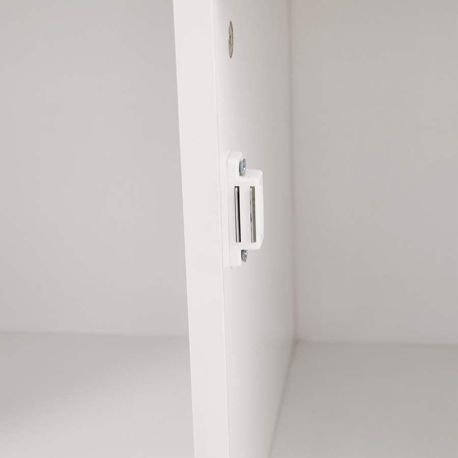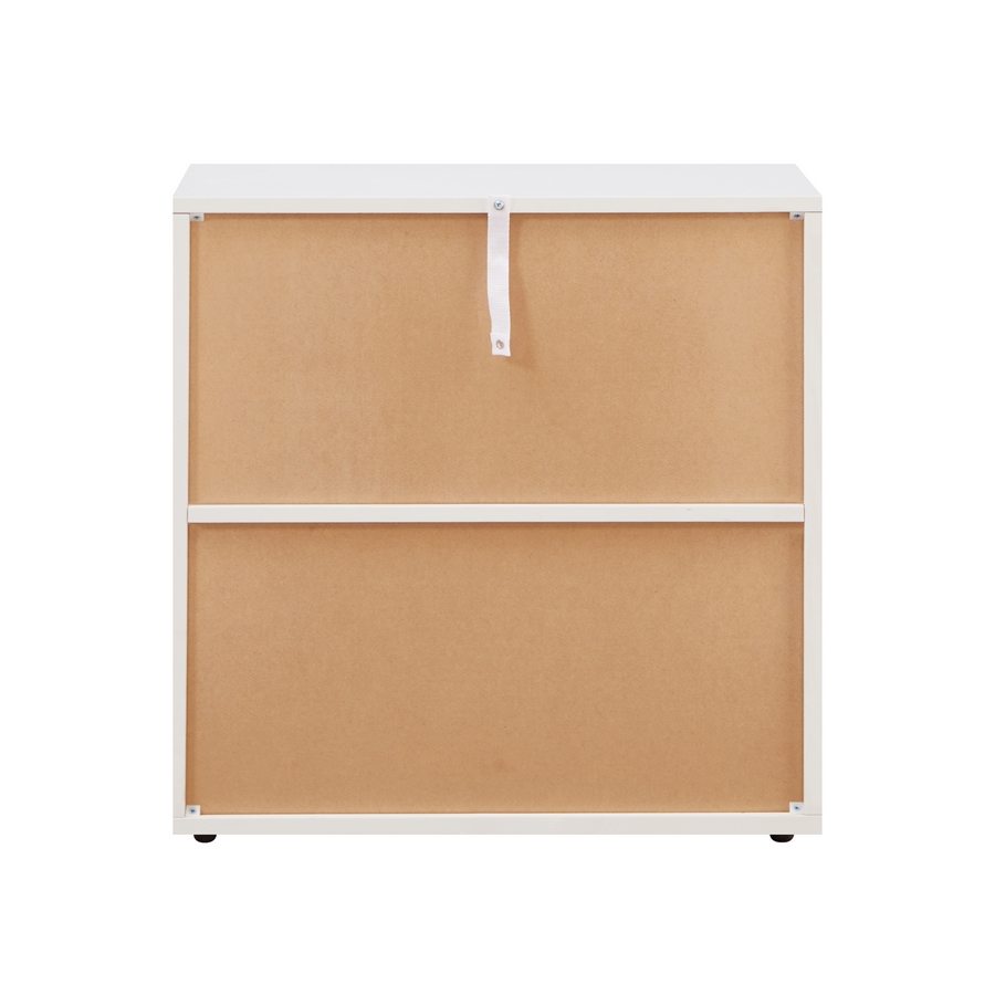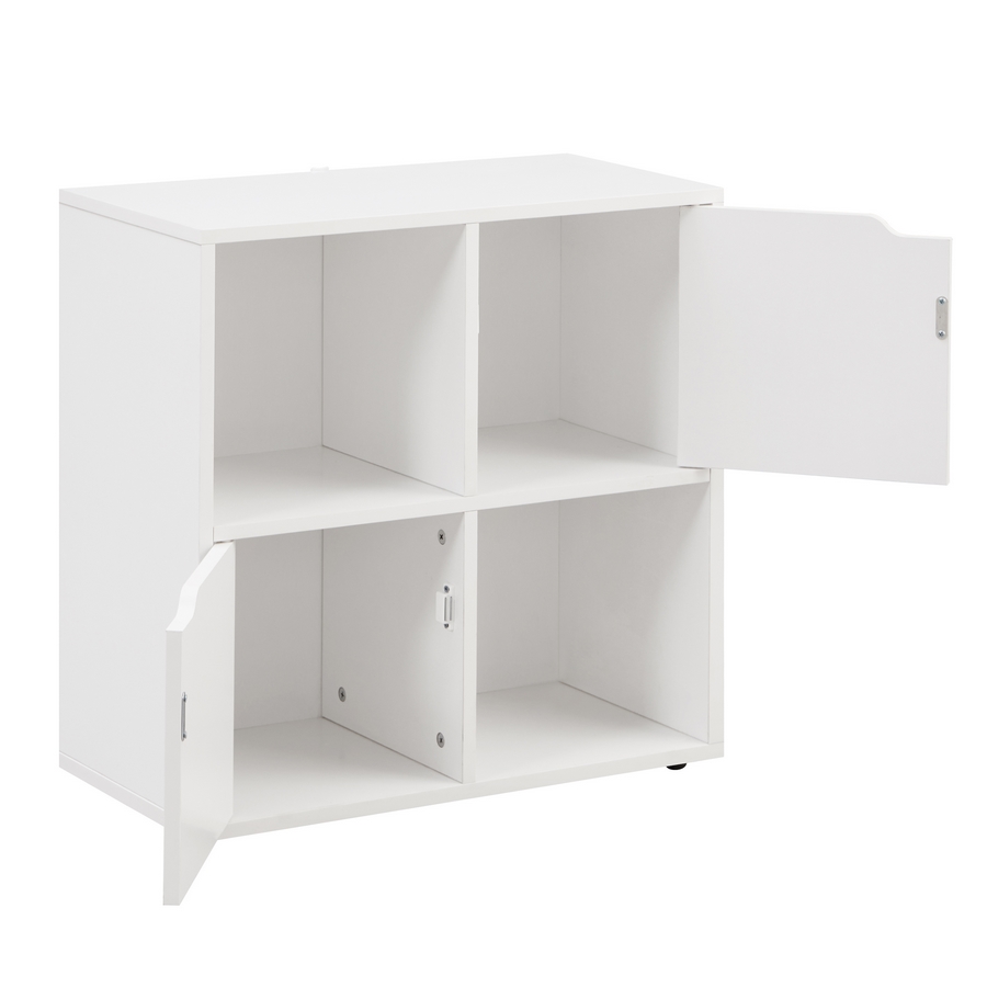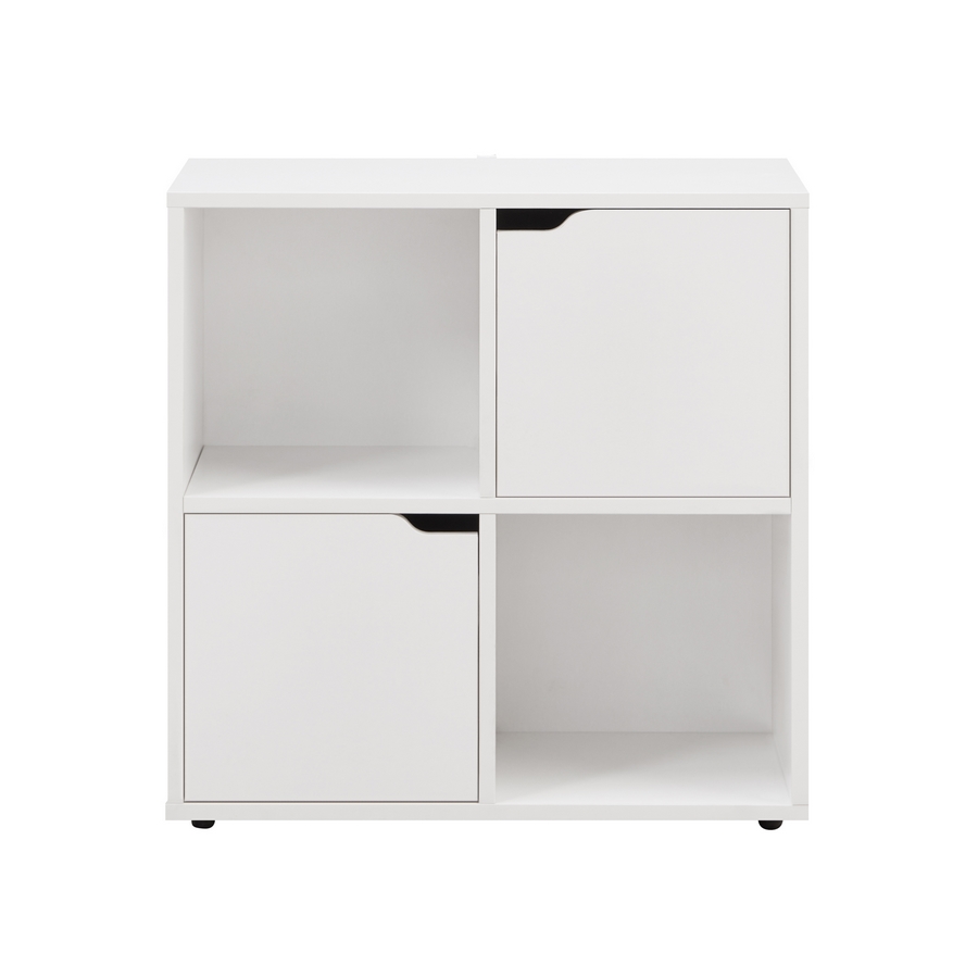 Mobile mensola libreria 4 cubi e 2 ante, colore bianco. Dimensioni (LxPxA): 59,6x29x61,3 cm. Materiale legno truciolare Sp. 15 mm, ante in MDF Sp. 15 mm, piedi in plastica nera.