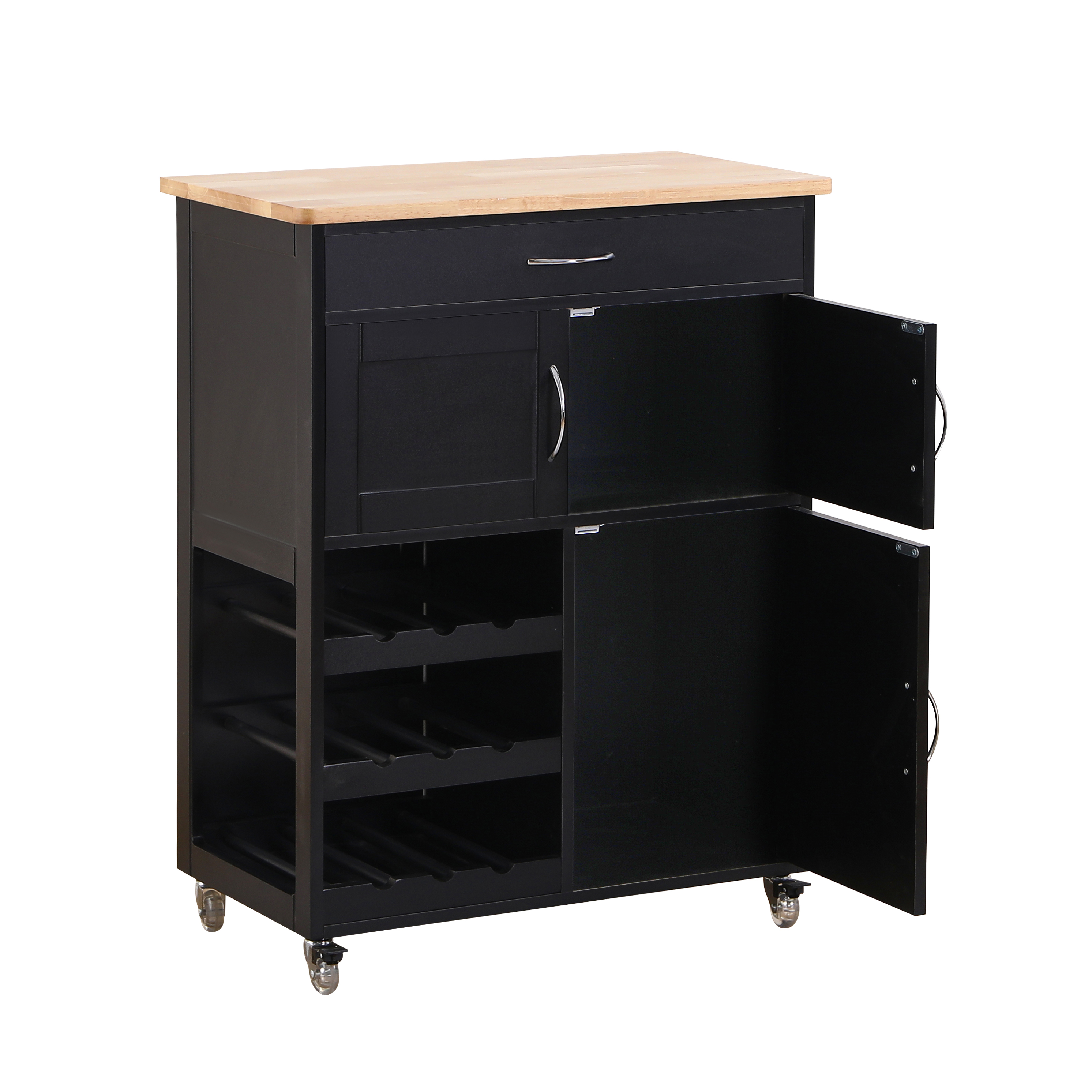 Realizzato con un solido telaio nero e un elegante piano di lavoro in MDF di rovere chiaro, questo carrellino si distingue per il suo design moderno e sofisticato. Le sue generose dimensioni di 67x36x87 cm gli conferiscono un'ottima capacità di stoccaggio, rendendolo l'alleato perfetto per organizzare e ottimizzare lo spazio in cucina.