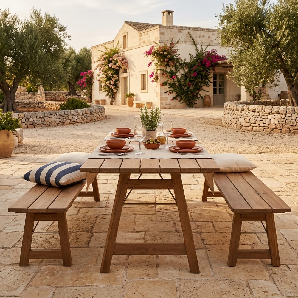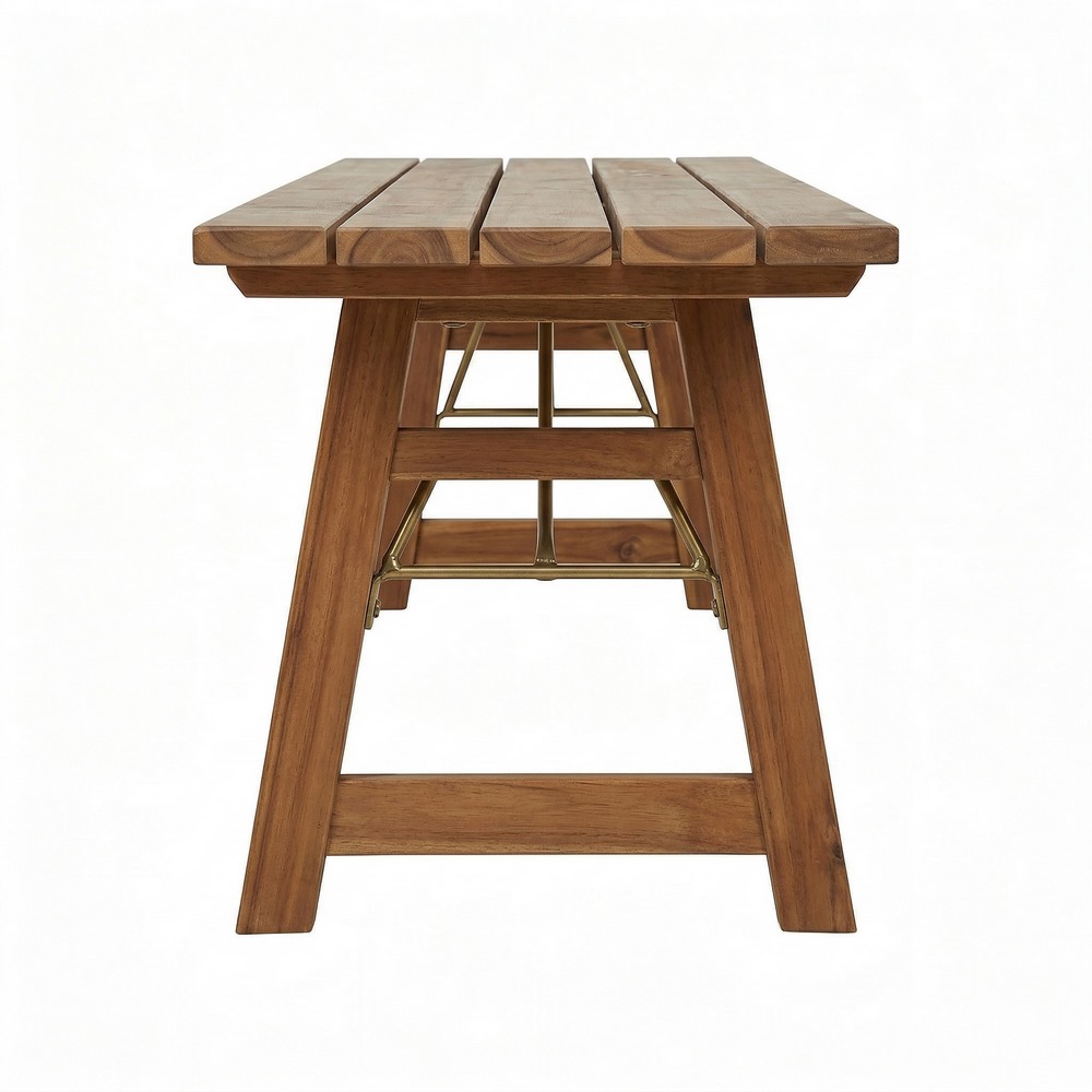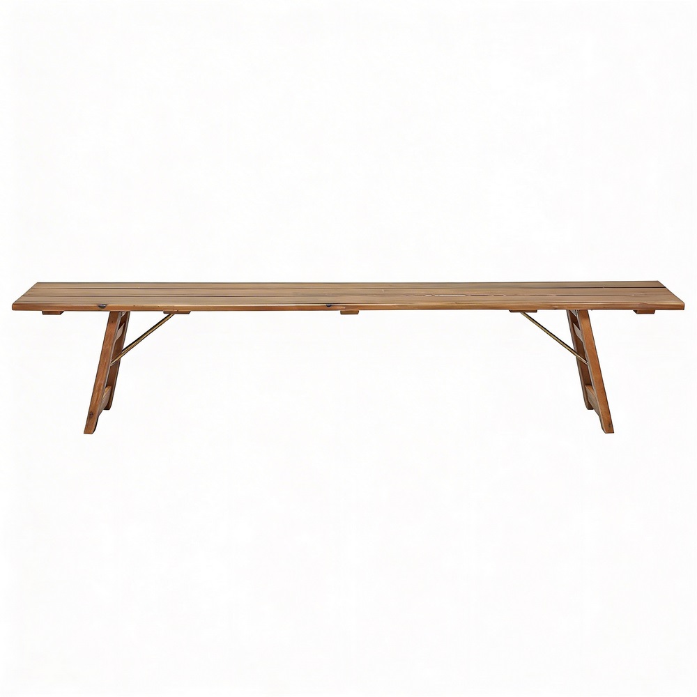 Panca in legno di acacia oliata con gambe pieghevoli. Dimensioni (LxPxA): 220x35x55 cm.