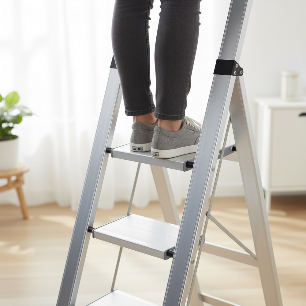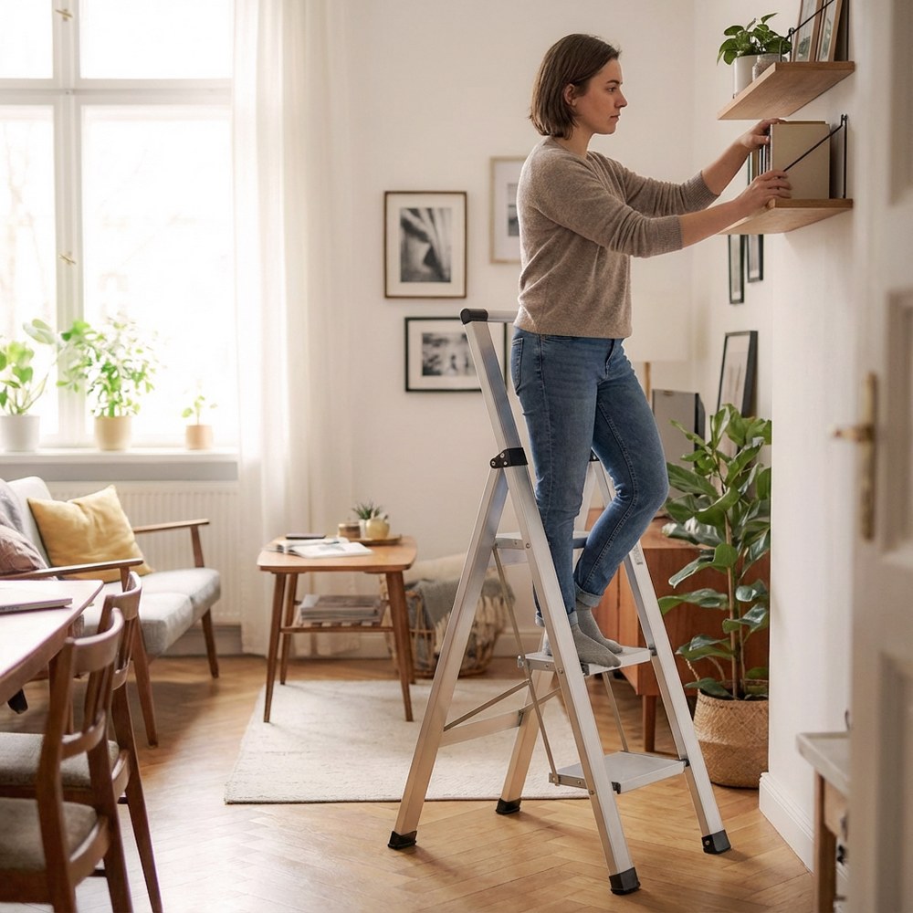 Questa scala domestica in alluminio a 3 gradini è progettata per offrire praticità, stabilità e sicurezza nelle attività quotidiane. Ideale per l’uso in casa, consente di raggiungere facilmente mensole, armadi o punti rialzati, risultando perfetta per piccoli lavori domestici, pulizie e sistemazioni.