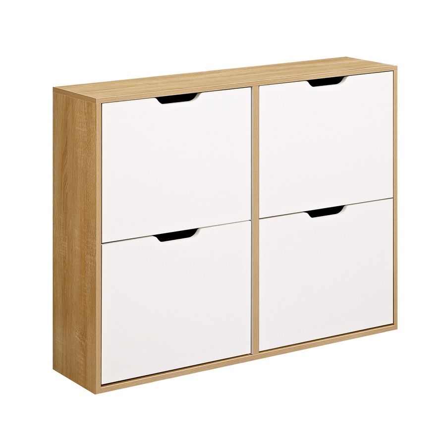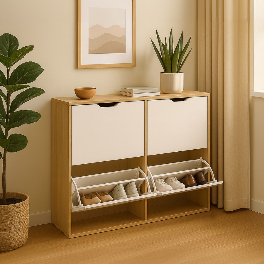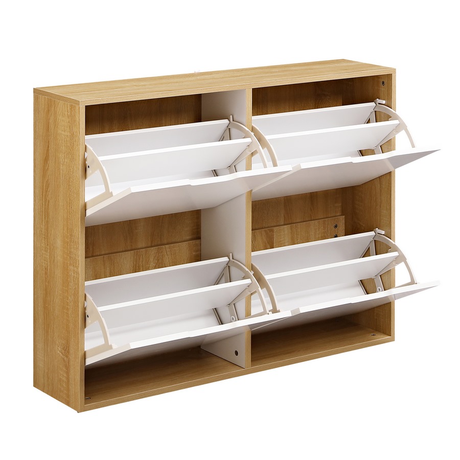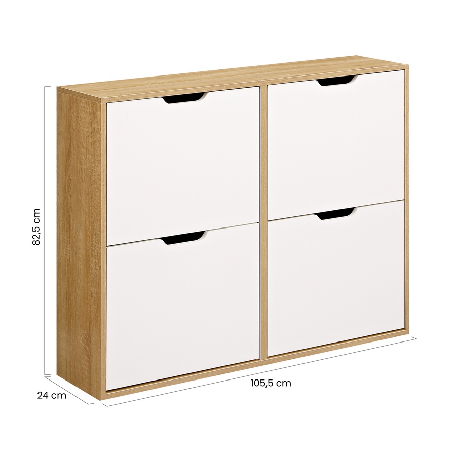 Questa scarpiera a 4 vani combina estetica moderna e praticità, grazie all’abbinamento del bianco con il rovere naturale. La struttura compatta e salvaspazio la rende ideale per ingresso, camera da letto o guardaroba. I vani ribaltabili permettono di organizzare ordinatamente scarpe e accessori, mantenendo l’ambiente sempre in ordine.