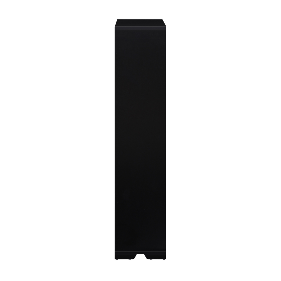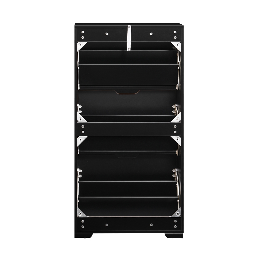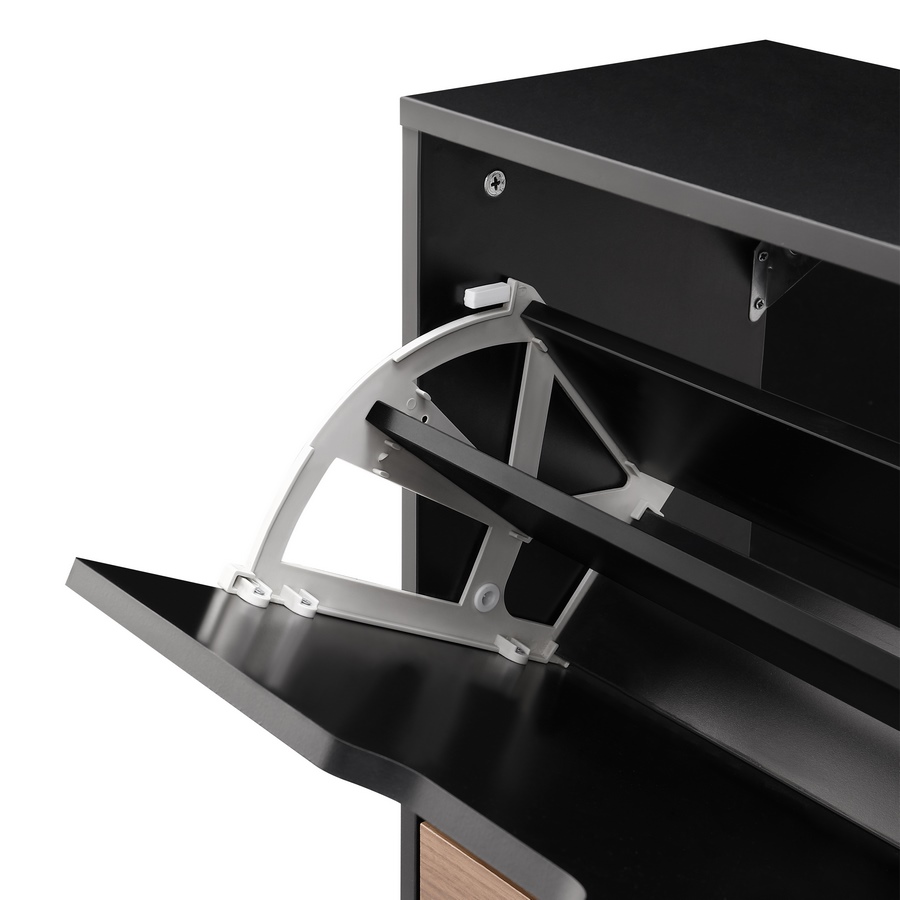 Scarpiera 3 ante a ribalta con divisorio interno in plastica, colore noce e nero. Dimensioni (LxPxA): 63x26x125 cm. Materiale legno melaminico Sp.15 mm. Ante nere lavorazione blister cannettata. Gambe metalliche.