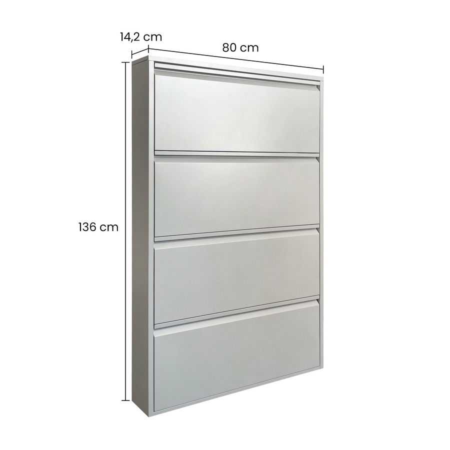 Grazie alle 4 ante a ribalta dotate di apertura inclinata, la scarpiera Emy offre uno spazio interno generoso e ben organizzato, perfetto per contenere fino a 16 paia di scarpe, mantenendole al riparo da polvere e disordine. Ogni vano è studiato per offrire massima funzionalità e facile accessibilità, anche nelle routine quotidiane più frenetiche. Con una profondità ridotta di soli 14,2 cm, si inserisce armoniosamente anche in ambienti stretti, come ingressi, corridoi o zone di servizio, senza compromettere il passaggio o l’estetica dell’ambiente.