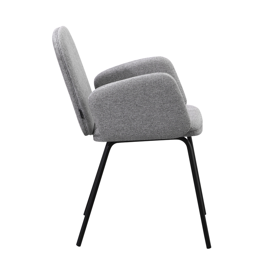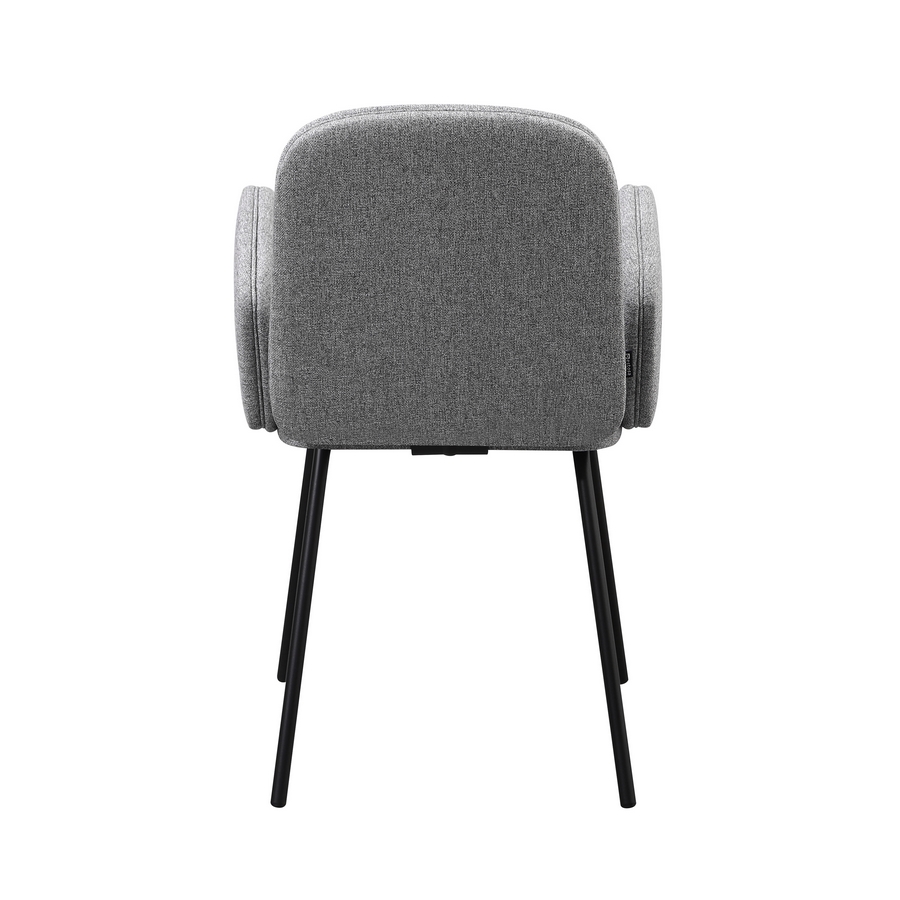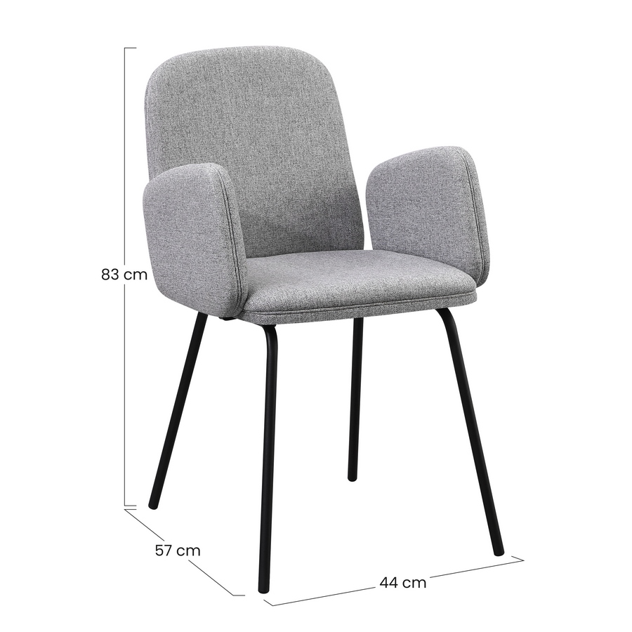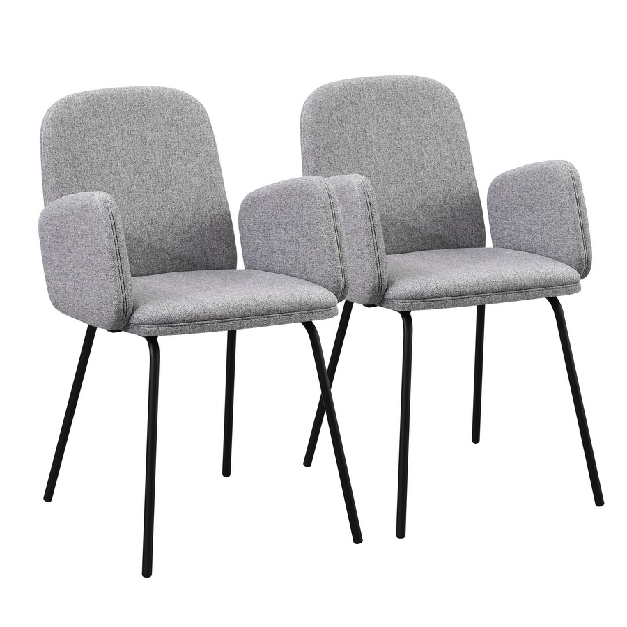 Questo set di 2 sedie offre uno stile moderno e luminoso grazie al rivestimento in tessuto grigio chiaro, ideale per ambienti contemporanei. La seduta imbottita con braccioli integrati assicura un comfort superiore, mentre le gambe in metallo nero garantiscono solidità e un look elegante, perfetto per cucine, sale da pranzo e living.