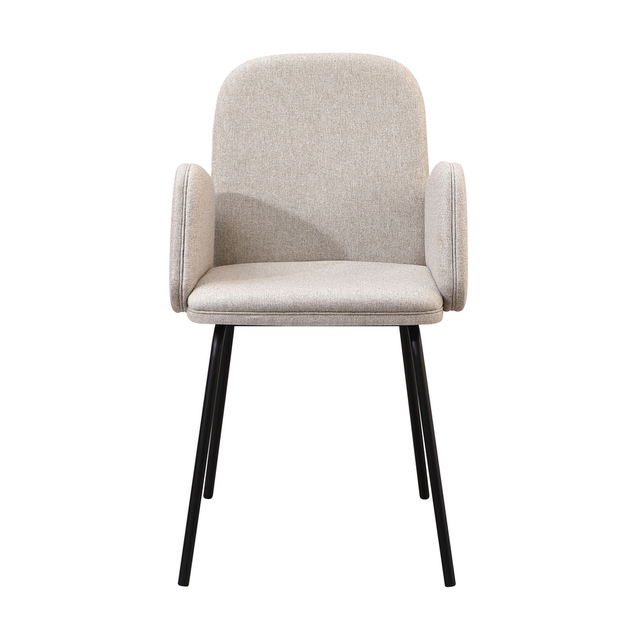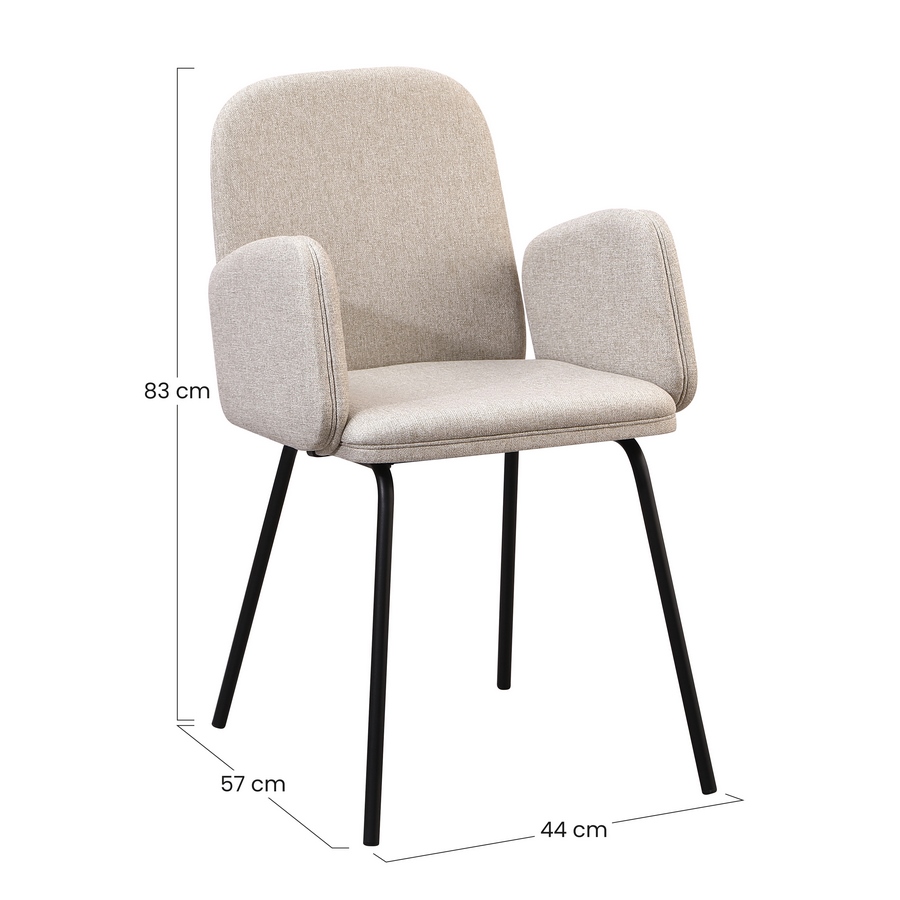 Questo set di 2 sedie unisce comfort e stile contemporaneo. La seduta imbottita in tessuto beige offre una sensazione accogliente e raffinata, mentre i braccioli integrati migliorano l’ergonomia. Le gambe in metallo nero garantiscono stabilità e un look moderno, adatto a cucine, sale da pranzo e living.