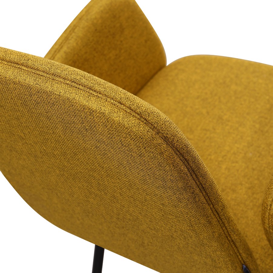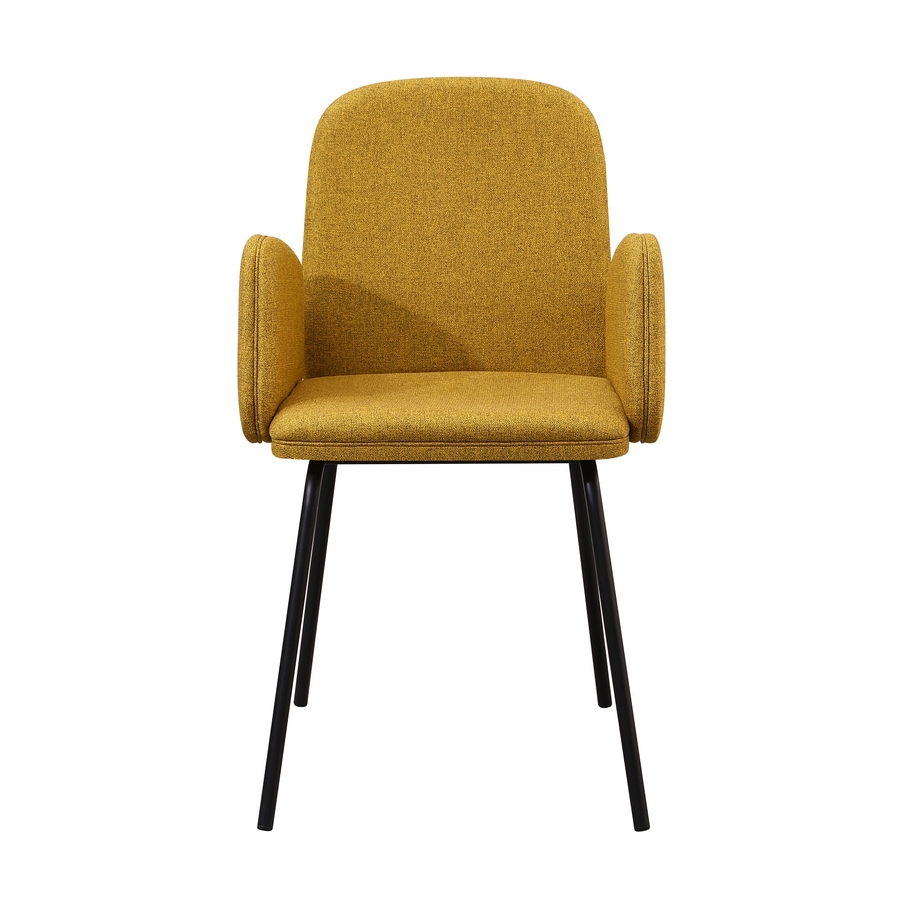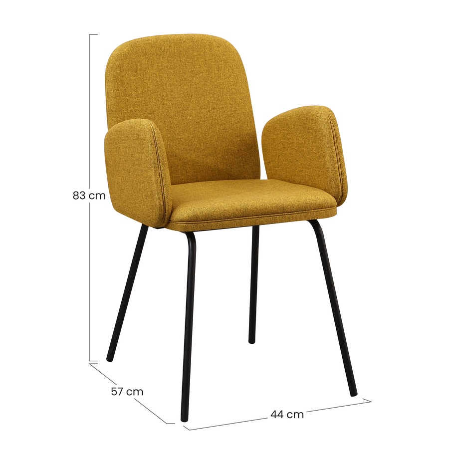 Questo set di 2 sedie unisce comfort, design moderno e un tocco di colore deciso. Il rivestimento in tessuto ocra aggiunge calore e personalità all’ambiente, mentre i braccioli integrati garantiscono una seduta comoda e accogliente. Le gambe in metallo nero offrono stabilità e un look contemporaneo, ideale per cucine, sale da pranzo e zone living.