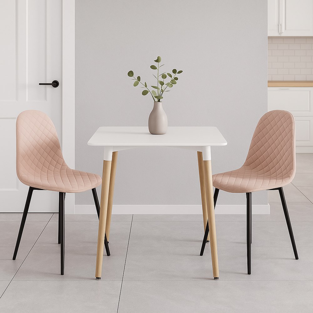 Set da 4 sedie in ecopelle trapuntata. Dimensioni (LxPxA): 43x42x86 cm. Dimensioni seduta: 42 cm. Altezza seduta: 48 cm. Struttura in metallo 25x0,9 mm. Gambe in metallo 20x0,1 mm verniciate nere. Colore: sabbia.