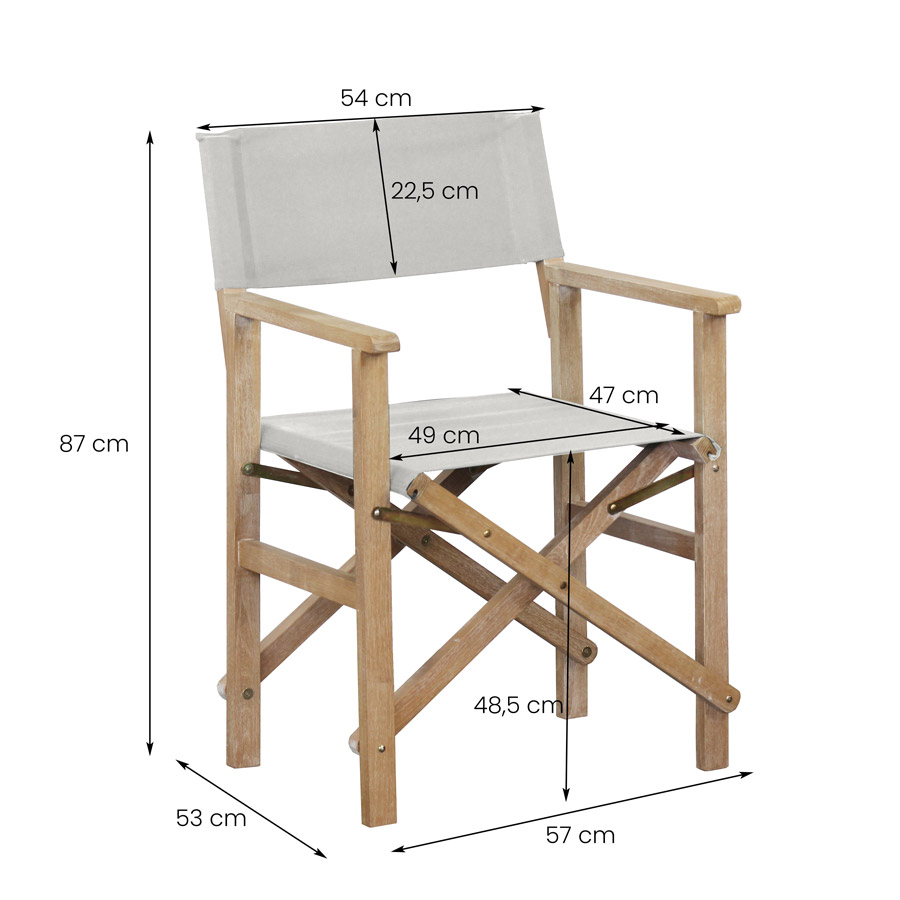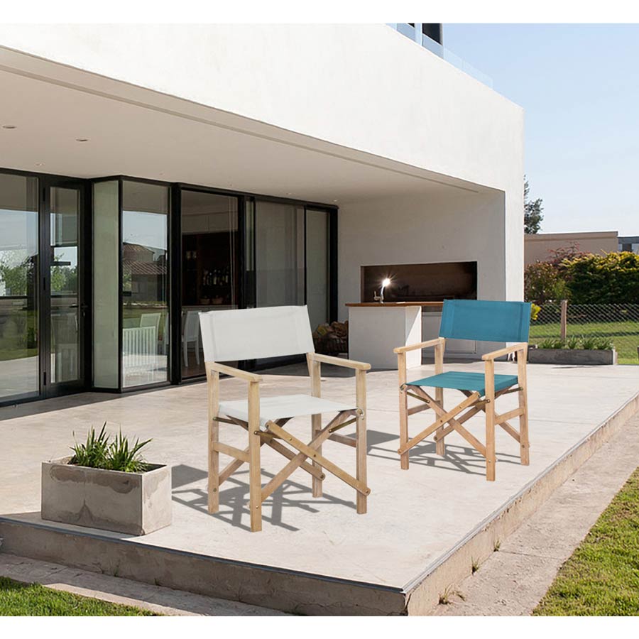 Sedia da giardino richiudibile regista Brindisi - Dim. singola sedia: 57 x 53 x H. 87 cm - Dim. singola sedia chiusa: 53 x 17 x H. 87 cm - Robinia decapata AQ - Tessuto Cotone-Poliestere 360gr/m2 - Altezza da terra a seduta: 48,5 cm
