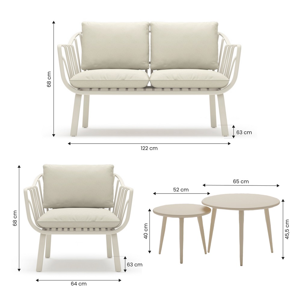 Il set è composto da 1 divano a 2 posti, 2 poltrone e 2 tavolini coordinati di diverse dimensioni, perfetti per appoggiare bevande, libri o accessori decorativi. La tonalità avorio si abbina facilmente a cuscini e complementi dai colori naturali o vivaci.