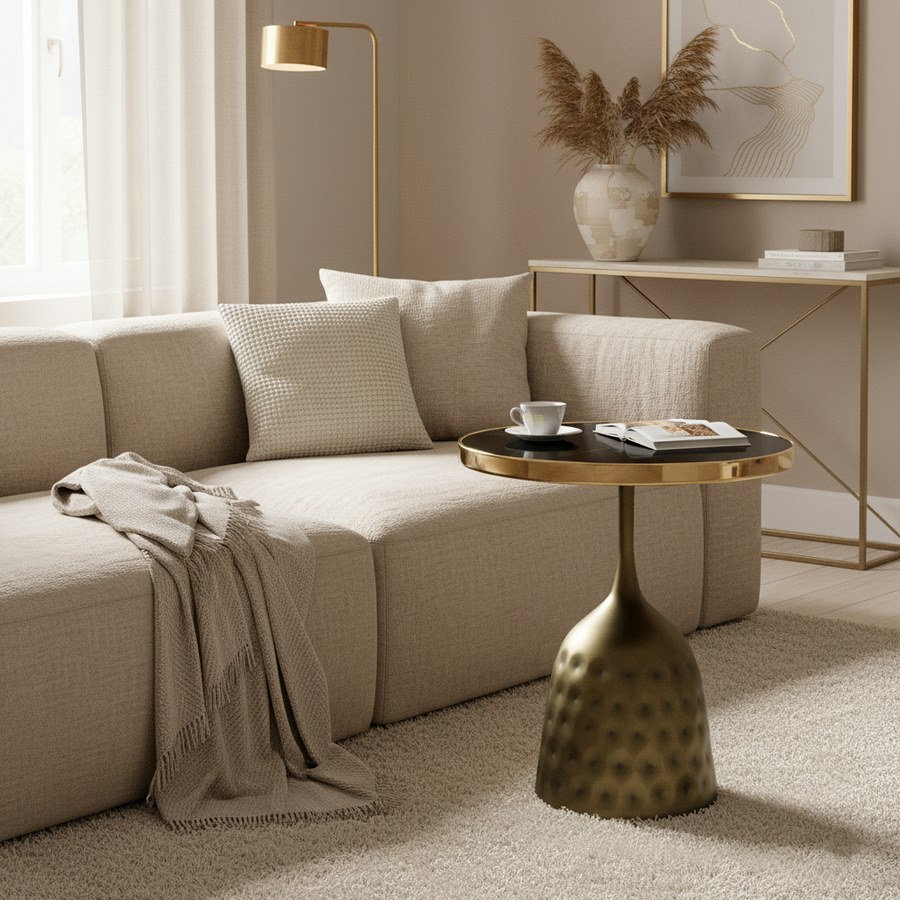 Consiglio d’arredo: perfetto accanto a un divano moderno o poltrona lounge, questo tavolino valorizza ambienti contemporanei grazie al contrasto tra il top scuro e la lucentezza del rame.