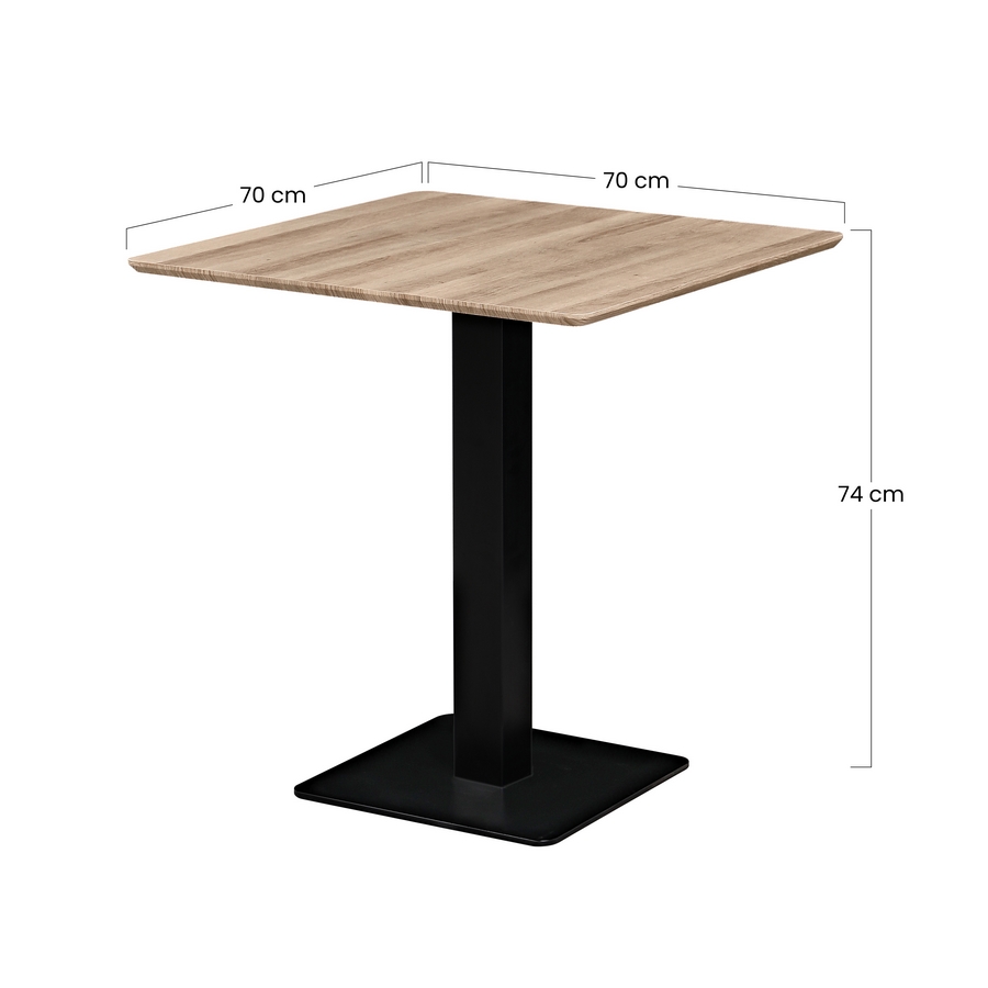 Questo tavolo quadrato dal design moderno è una soluzione elegante e funzionale per cucine e zone pranzo. Il top in MDF effetto rovere, spesso 18 mm e con bordo svasato, offre un aspetto naturale e contemporaneo. La colonna centrale nera a sezione quadrata dona stabilità e un’identità visiva decisa, mentre la piastra in ferro garantisce solidità e lunga durata.