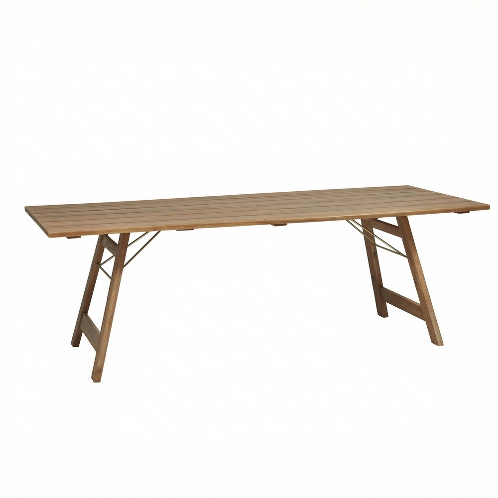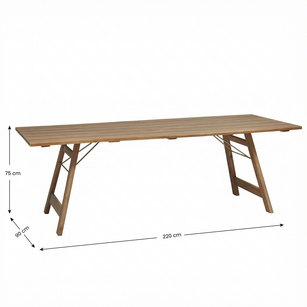 Le gambe pieghevoli permettono di richiudere facilmente il tavolo, rendendolo comodo da spostare e riporre quando non in uso. Le ampie dimensioni 220 x 90 cm lo rendono ideale per ospitare più persone in totale comfort.