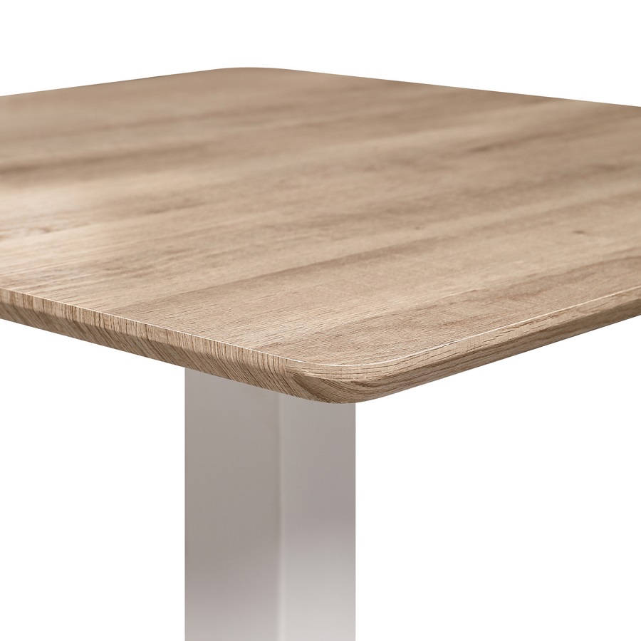 Questo tavolo quadrato unisce uno stile moderno e lineare alla praticità quotidiana. Il top in MDF effetto rovere, spesso 18 mm e con bordo svasato, dona un look naturale e contemporaneo. La colonna centrale bianca a sezione quadrata offre un design pulito e di grande stabilità, mentre la piastra in ferro assicura solidità e lunga durata. Perfetto per cucine, sale da pranzo o piccoli ambienti living.