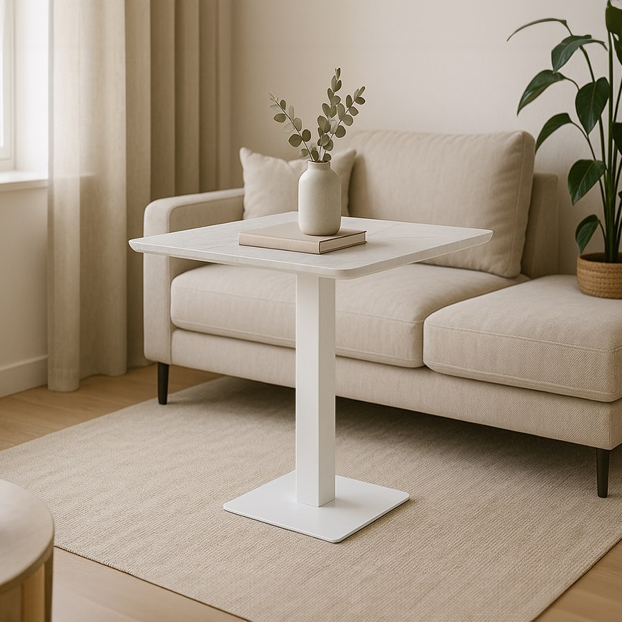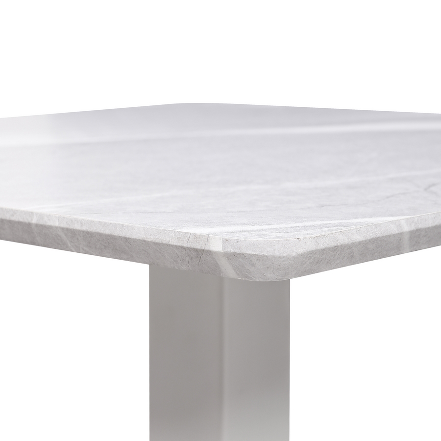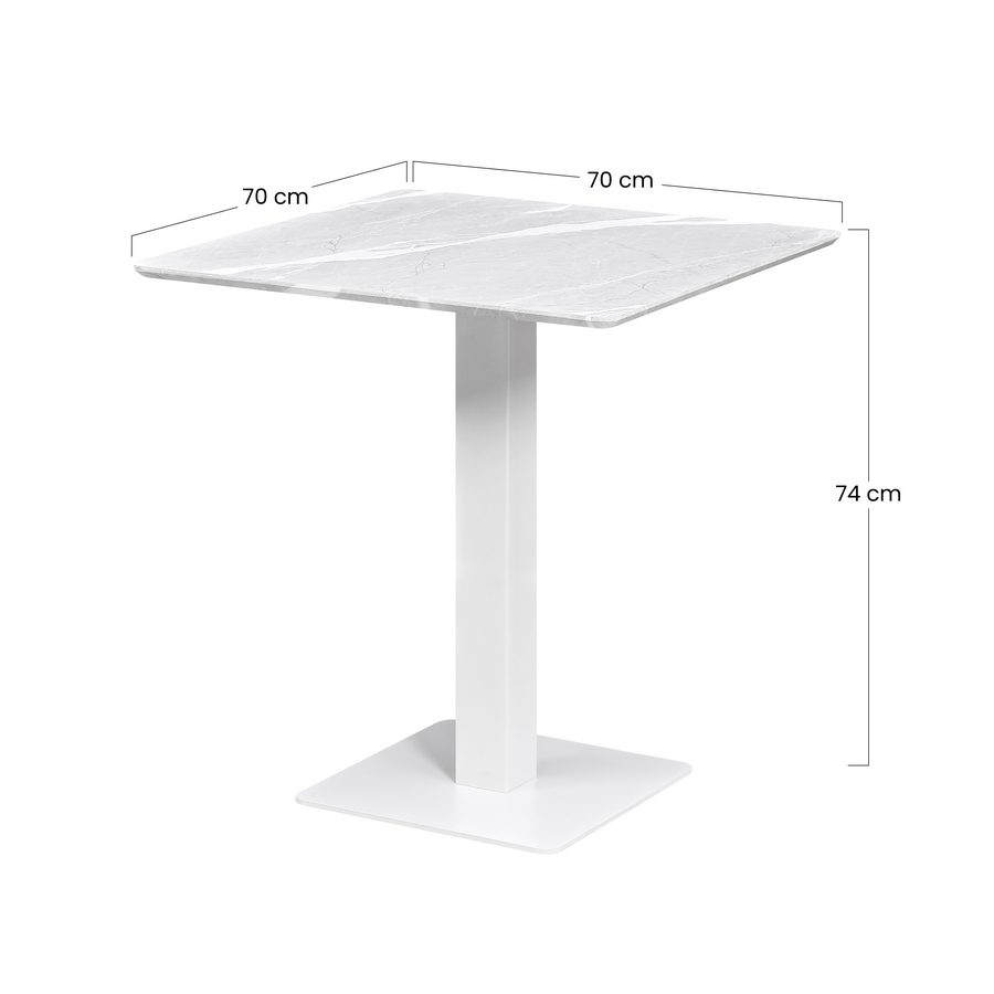 Questo tavolo quadrato offre un design moderno e raffinato grazie al top effetto marmo grigio chiaro, perfetto per aggiungere eleganza a cucine e spazi living. Il piano in MDF da 18 mm con bordo svasato unisce estetica e resistenza, mentre la colonna centrale bianca a sezione quadrata dona un look pulito e contemporaneo. La solida piastra in ferro assicura stabilità e lunga durata.