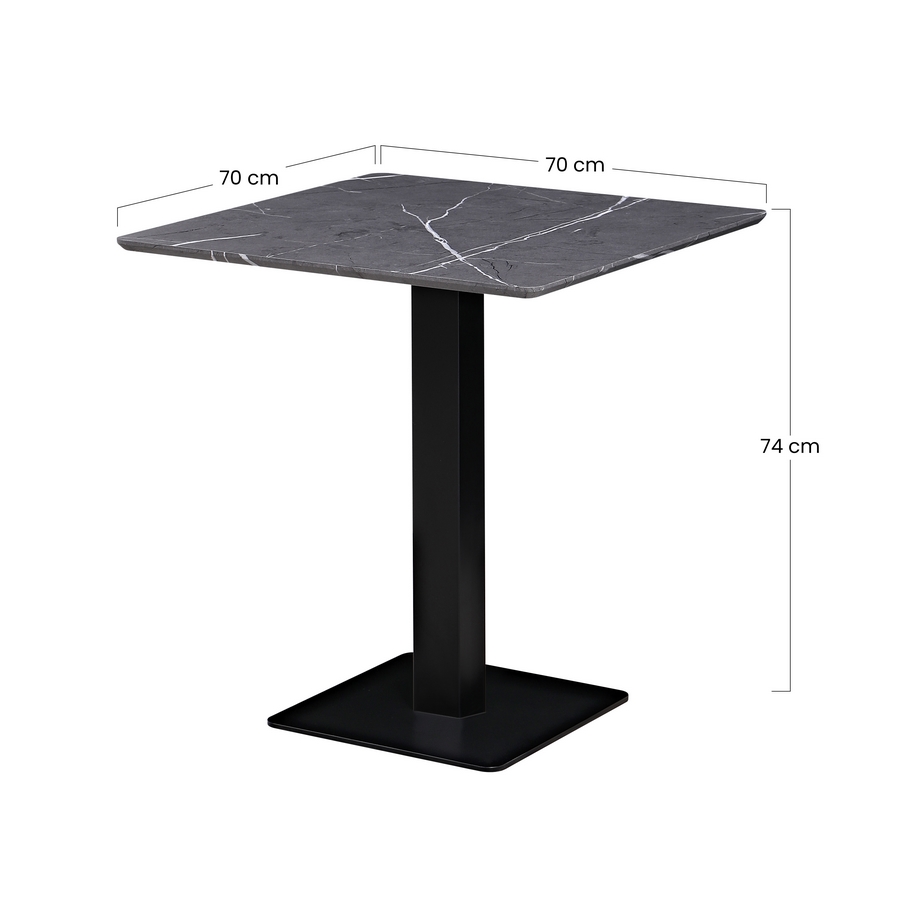 Questo tavolo quadrato presenta un design moderno e ricercato, caratterizzato dal top effetto marmo grigio scuro che dona profondità ed eleganza all’ambiente. Il piano in MDF da 18 mm con bordo svasato combina resistenza e stile, mentre la colonna centrale nera a sezione quadrata garantisce stabilità e un look contemporaneo. La solida piastra in ferro assicura una base robusta, ideale per l’uso quotidiano in cucina o zona living.