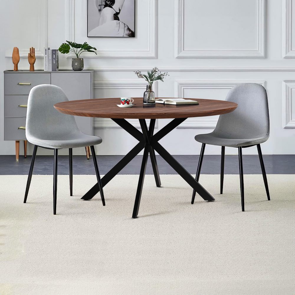Il tavolo da pranzo tondo da 140 cm con top effetto noce è la scelta ideale per chi desidera coniugare funzionalità, calore e design moderno. Il piano in MDF spesso 25 mm è caratterizzato da una finitura effetto legno noce che richiama le venature naturali e dona un senso di accoglienza a qualsiasi ambiente. La struttura a gambe incrociate in metallo verniciato nero, con profilo tubolare da 30x60 mm (spessore 1,2 mm), garantisce una solida base e un aspetto elegante e contemporaneo.